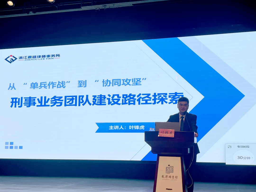 震瓯快讯丨我所执行主任叶锋虎律师受邀参加龙湾律师行业宣讲会 分享刑事团队建设路径 2025年10月31日,温州市龙湾区司法局、温州市律师协会龙湾律师工作委员会联合举办2025年温州龙湾区律师行业职业道德与执业纪律宣讲会,我所执行主任叶锋虎律师受邀担任主讲嘉宾,以“从‘单兵作战’到‘协同攻坚’”为主题,分享我所刑事业务二部团队的建设路径与探索。会上,叶锋虎主任介绍了震瓯刑事···2025-11-04